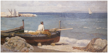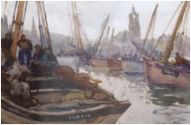 For the next fifteen years Staithes, along with Newlyn, played host to artists of international stature and witnessed the move from realism to impressionism. The period from 1901 to 1907 was the most productive and coincided with the formation of the Staithes Art Club. Prior to 1901 artists of the Staithes Group had exhibited with the Yorkshire Union of Artists; this had been formed in 1887 and both Ernest Rigg and Rowland Hill had been elected to the council of the Union. In 1901 the Staithes Group broke away from the Yorkshire Union of Artists and decided to hold their own exhibition at the Fishermen’s Institute in Staithes. No records have survived of this first exhibition and no critique was offered by the Whitby Gazette; however it was sufficiently successful for a committee to be formed charged with organising the 1902 exhibition to be held at the Fishermen’s Institute in August. The committee elected Silkstone Hopwood (chairman) and Richard Bagshawe (secretary); also present were Thomas Barrett, John Bowman, Ernest Dade, Arthur Friedenson, Rowland Hill, Hannah Hoyland, Spence Ingall, Fred Jackson, Isa Jobling, Laura Johnson, Harold Knight, Charles Hodge Mackie, Frank Mason, Fred Mayor, Ernest Rigg, Albert Stevens and Mark Senior. The 1902 exhibition was a success and this time the Whitby Gazette published a comprehensive review. An entrance fee was levied and the proceeds given to the Fishermen’s Institute. The 1903 exhibition was also held at Staithes; in 1904 the exhibition moved to the Anderson Gallery in Whitby as it had outgrown the Fishermen’s Institute. Edward Anderson had been elected a member of the Staithes Art Club in 1904 and the gallery in Whitby belonged to his father. This was to be the last independent exhibition; from 1905 until the Staithes Art Club disbanded in 1907, the exhibitions were absorbed into the annual exhibitions of the Yorkshire Union of Artists. The success of the Staithes Group led to it own demise. There was no location large enough to handle the increasing number of canvases and exhibitions in August clashed with the Summer Exhibition at the Royal Academy. Finally there was a limit to the number of wealthy patrons in the North East, not enough to sustain the ambitions of painters who were eagerly seeking fresh horizons. After 1907 the group disbanded and the artists went their separate ways. Fred Jackson, Mark Senior, Rowland Hill and Albert Stevens continued to work in the Staithes area,but others drifted away. Ernest Dade and the Mayors moved to London, Friedenson to Dorset and Hopwood to France. In 1907 Harold and Laura Knight decided to join Stanhope Forbes in Newlyn. They had first been introduced to the work of the Newlyn School whilst still at Nottingham School of Art. In 1894 they had seen an exhibition of the Newlyn Painters at the Nottingham Castle Museum. It was a tremendous wrench described by Laura in Oil Paint and Grease Paint: “Staithes had been one of the most vital influences in my life. To turn away from all that it had meant, fearing never to return, hurt me terribly. I hated leaving the moorland and the North Sea, the struggle that made you strong, the wild race of fisher people I loved so well. It was there that I had found what I might do.” During this period the artists had been accepted by the fisherfolk of Staithes and had been absorbed into the fabric of the village. They had shared the hardship wrought by the sea, they had grieved at its senseless taking and had shared in the joys of a tight knit community. Their presence had supplemented an ailing economy. There were lodgings to be paid for, studios to rent and models to hire. It was an unlikely partnership cemented by a mutual respect.